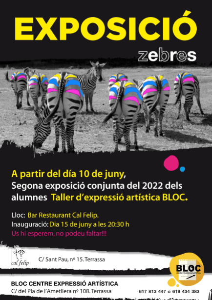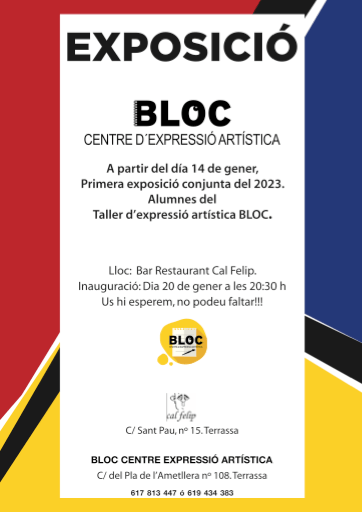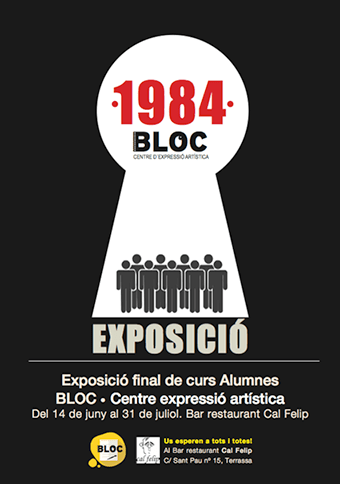 Del 14 de juny al 31 de juliol al Bar Restaurant Cal Felip de Terrassa, es podrà veure l’expossició col·lectiva dels alumnes de dibuix i pintura de Bloc, Centre Expressió artística, amb unes 20 obres aproximadament sota el títol de «1984», la famosa novel·la de George Orwell.